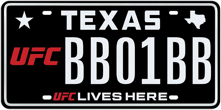 Ultimate Fighting Championship - This new plate design is proposed by My Plates, the State’s specialty plate marketing vendor. This plate will be offered both as a standard flat plate and a premium embossed (raised alpha numeric characters) plate. The proceeds of the sale of this plate are shared between the Texas General Revenue Fund and My Plates according to the contract between the State and My Plates.